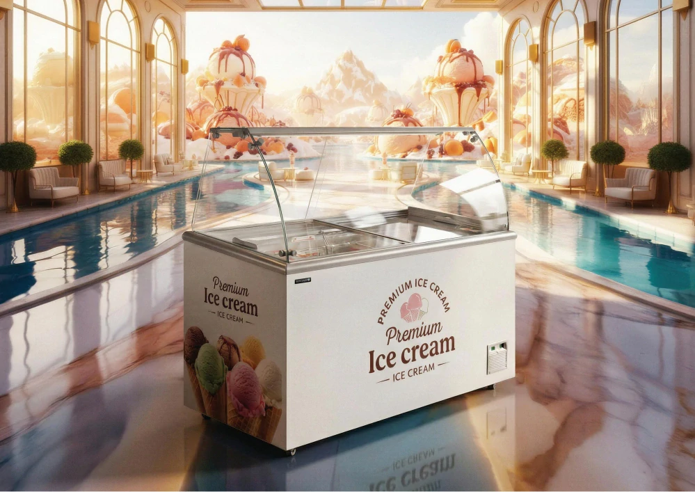 přední oblé sklo|posuvná prosklená víka|úložný prostor pod koši|ideální pro reklamní polepy|vnitřní LED osvětlení|pevná kolečka|statické chlazení